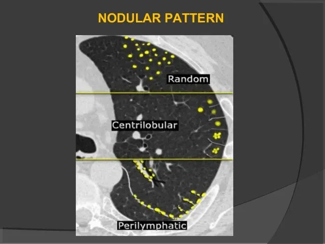 | Peri lymphatic: lymph system spreadgret | Inflammatory | Sarcoidosis, pneumoconiosis |